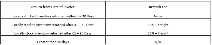 This policy applies to all customers, unless superseded by a separate, written agreement that includes specific return goods terms and conditions. Freight and restocking will apply as noted in the Restock Fee Schedule listed below, unless superseded by a written agreement. Issuance of an RA number does not guarantee credit. Credit issuance is dependent on confirmed receipt/review of returned products and is subject to the other terms of this policy.