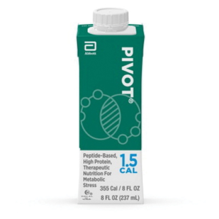 Pivot® Therapeutic Nutrition, 33.8 oz Net Content, Liquid Form, Ingredients: Water, Corn Syrup Solids, Hydrolyzed Sodium Caseinate, Whey Protein Hydrolysate, Structured lipid (Interesterified Marine Oil [Contains One or More of the Following: Anchovy, Cod, Menhaden, Pollock, Salmon, Sardine, Tuna] and Medium Chain Triglycerides), Soy Oil, Canola Oil, L-Arginine, Short-Chain Fructooligosaccharides. <0.5% of: Potassium Citrate, Citric Acid, Calcium Phosphate, Magnesium Chloride, Soy Lecithin, Magnesium Phosphate, Choline Chloride, Natural and Artificial Flavor, Ascorbic Acid, Cellulose Gel, Potassium Chloride, Carrageenan, Potassium Hydroxide, Taurine, L-Carnitine, Cellulose Gum, Zinc Sulfate, Ferrous Sulfate, d-Alpha-Tocopheryl Acetate, Niacinamide, Manganese Sulfate, Calcium Pantothenate, Copper Sulfate, Thiamine Hydrochloride, Pyridoxine Hydrochloride, Riboflavin, Beta-Carotene, Vitamin A Palmitate, Chromium Chloride, Folic Acid, Sodium Molybdate, Sodium Selenate, Potassium Iodide, Phylloquinone, Biotin, Vitamin D3 and Vitamin B12, 33.8 oz Serving, Directions: Shake well prior to opening, Store unopened at room temperature, once opened, reclose, refrigerate and use within 48 hr, 1.5 cal/mL Calories Per Serving, Warning: Not for IV use, not suitable for people with galactosemia