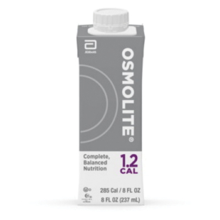 Osmolite® Complete Balanced Nutrition, 8 oz Net Content, Reclosable Carton Container, Liquid Form, Ingredients: Water, Corn Maltodextrin, Sodium Caseinate, High Oleic Safflower Oil, Calcium Caseinate, Canola Oil, Medium Chain Triglycerides. <0.5% of: Potassium Citrate, Calcium Phosphate, Magnesium Phosphate, Soy Lecithin, Potassium Chloride, Sodium Citrate, Magnesium Chloride, Choline Chloride, Cellulose Gel, Ascorbic Acid, Potassium Phosphate, Potassium Hydroxide, Taurine, L-Carnitine, Cellulose Gum, DL-Alpha-Tocopheryl Acetate, Ferrous Sulfate, Zinc Sulfate, Manganese Sulfate, Niacinamide, Copper Sulfate, Calcium Pantothenate, Thiamine Hydrochloride, Riboflavin, Pyridoxine Hydrochloride, Beta-Carotene, Vitamin A Palmitate, Folic Acid, Chromium Chloride, Potassium Iodide, Sodium Molybdate, Sodium Selenate, Biotin, Phylloquinone, Vitamin D3 and Vitamin B12, 8 oz Serving, Directions: Shake well prior to opening, Store unopened at room temperature, once opened, reclose, refrigerate and use within 48 hr, 1.2 cal/mL Calories Per Serving, Warning: Not for IV use, not suitable for people with galactosemia