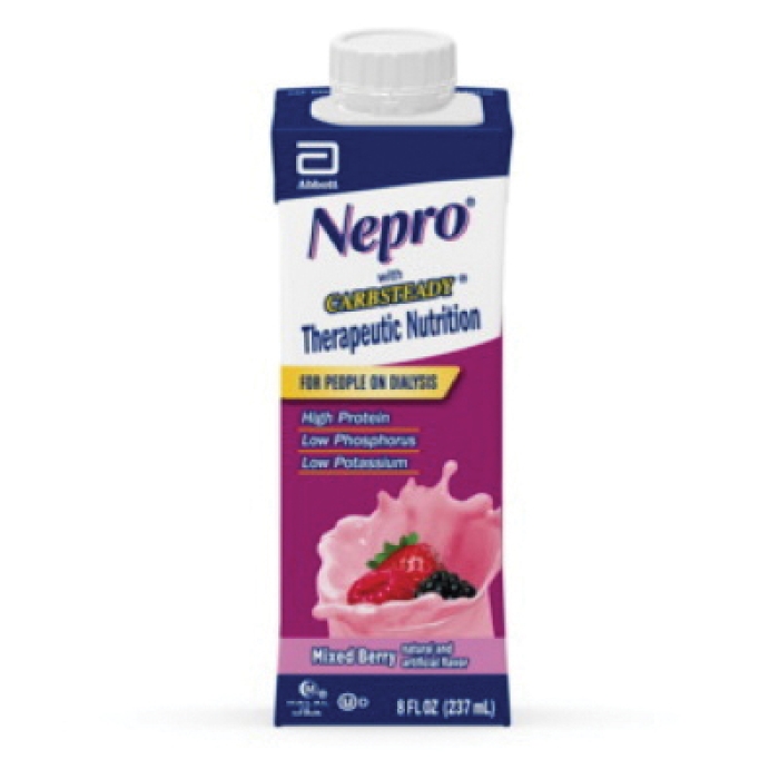 Nepro® Therapeutic Nutrition, 8 oz Net Content, Reclosable Carton Container, Liquid Form, Ingredients: Water, Corn Syrup Solids, Caseinates (Calcium, Magnesium, Sodium), High Oleic Safflower Oil, Canola Oil, Sugar, Milk Protein Isolate. <2% of: Soluble Corn Fiber, Glycerin, Short-Chain Fructooligosaccharides, Soy Lecithin, Natural and Artificial Flavor, Calcium Citrate, Sodium Citrate, Potassium Citrate, Choline Chloride, Salt, Cellulose Gel, Ascorbic Acid, L-Carnitine, Taurine, Potassium Chloride, Cellulose Gum, Niacinamide, Ferrous Sulfate, Zinc Sulfate, D-Alpha-Tocopheryl Acetate, Red 3, Pyridoxine Hydrochloride, Calcium Pantothenate, Manganese Sulfate, Copper Sulfate, Thiamine Hydrochloride, Riboflavin, Blue 1, Vitamin A Palmitate, Folic Acid, Potassium Iodide, Chromium Chloride, Sodium Selenate, Sodium Molybdate, Biotin, Phylloquinone, Vitamin D3 and Vitamin B12, 8 oz Serving, Vanilla Flavor, Directions: Store unopened at room temperature; avoid extreme temperatures, shake well prior to opening, once opened, reclose, refrigerate and use within 48 hr, if consumed directly from the container, cover, refrigerate and use within 24 hr, 1.8 cal/mL Calories Per Serving, Warning: Not for IV use, not suitable for people with galactosemia