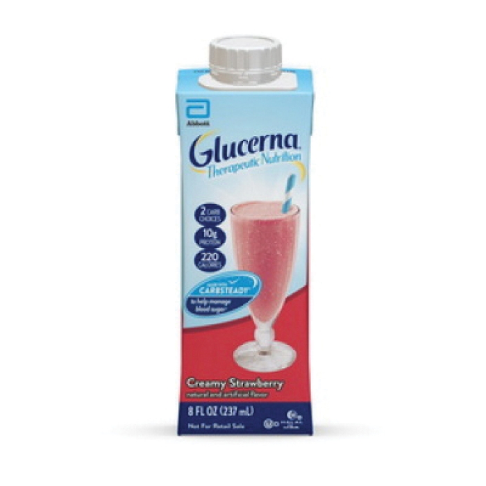 Glucerna® Therapeutic Nutrition Shake, 8 oz Net Content, Reclosable Carton Container, Liquid Form, Ingredients: Water, Corn Maltodextrin, Milk Protein Concentrate, Fructose, Canola Oil. <2% of: Glycerin, Soy Protein Isolate, Corn Oil, Soluble Corn Fiber, Soy Fiber, Short-Chain Fructooligosaccharides, Potassium Citrate, Magnesium Phosphate, Natural and Artificial Flavor, Salt, Choline Chloride, Ascorbic Acid, Cellulose Gel, Calcium Phosphate, Soy Lecithin, Monoglycerides, Potassium Chloride, Potassium Hydroxide, Calcium Carbonate, Carrageenan, Cellulose Gum, Ferrous Sulfate, DL-Alpha-Tocopheryl Acetate, Acesulfame Potassium, Zinc Sulfate, Niacinamide, Red 3, Calcium Pantothenate, Manganese Sulfate, Sucralose, Thiamine Hydrochloride, Pyridoxine Hydrochloride, Riboflavin, Copper Sulfate, Beta-Carotene, Vitamin A Palmitate, Folic Acid, Chromium Chloride, Potassium Iodide, Sodium Selenate, Sodium Molybdate, Phylloquinone, Biotin, Vitamin D3 and Vitamin B12, 8 oz Serving, Creamy Strawberry Flavor, Directions: Shake well, best served chilled, once opened, reclose, refrigerate and use within 48 hr, 180 cal Calories Per Serving, Warning: Not for tube feeding, not for sole-source nutrition, not for IV use, not suitable for people with galactosemia