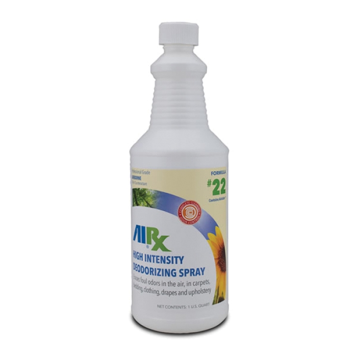 RX 22 is an instant action odor counteractant that eases foul odors in institutional, industrial and commercial situations. With AIRICIDE® odor counteractant it is designed to change the size and shape of odorous molecules so they are not recognized as the bad odors they would have been. Then, RX 22 leaves a pleasant residual aroma to freshen articles on which it is used.