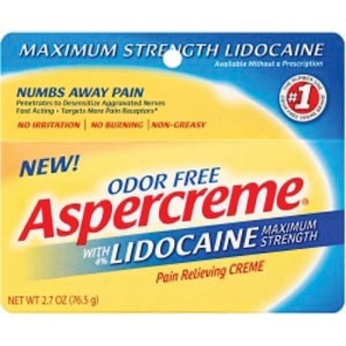 Aspercreme® Topical Pain Relief, 2.7 oz Net Content, Tube Container, Cream Form, Faint Medicinal Odor/Scent, Ingredients: Lidocaine, 4 % Strength
