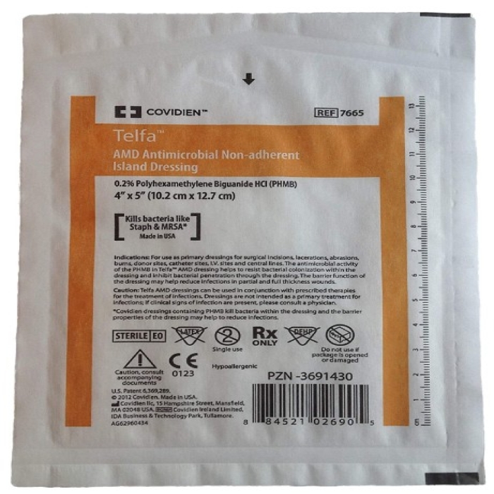 Non-Adherent Island Dressing, 4" x 5", Sterile 1s in Peel Back Package, contain PHMB which resists bacterial colonization and reduces bacterial penetration