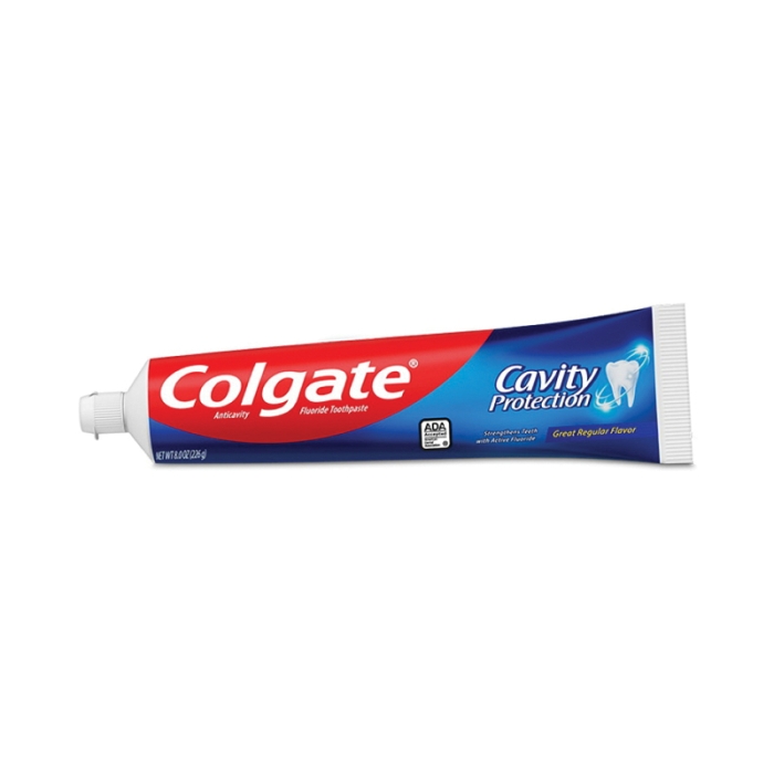 Colgate® Cavity Protection Toothpaste, Size: 1 oz, Active Ingredients: Sodium Monofluorophosphate (0.76% (0.15% w/v Fluoride Ion)), Inactive Ingredients: Dicalcium Phosphate Dihydrate, Water, Glycerin, Sodium Lauryl Sulfate, Cellulose Gum, Flavor, Tetrasodium Pyrophosphate, Sodium Saccharin, Directions: Adults and children 2 years of age and older: brush teeth thoroughly, preferably after each meal or at least twice a day or as directed by a dentist or physician. Children 2 to 6 years: use only a pea sized amount and supervise child's brushing and rising (to minimize swallowing). Children under 2 years: ask a dentist or physician