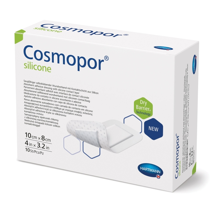 Cosmopor® Steril Island Dressing, Rectangular Shape, 3.2 in Width, 4 in Length, Silicone, White, Silicone Adhesive, Waterproof/Non-Waterproof: Waterproof, Sterile/Non-Sterile: Sterile, Latex-Free/Contains Latex: Latex-Free, HCPCS Code: A6413, 1.5 x 2.6 in Pad