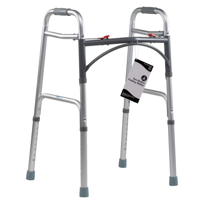 The dynarex two button walkers are a safe, dependable solution for those who need a convenient aid while performing daily activities. The walkers open and close with an easy-to-use pushbutton mechanism that may be operated by the user's fingers or palms and each side operates independently to allow for easy movement through narrow spaces. The tool-free button allows for height adjustments, raising and lowering the walker to accommodate any individual. The design is also inclusive of contoured handgrips for added patient comfort.