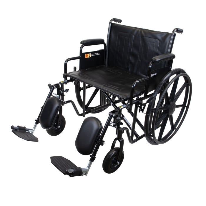 dynarex Bariatric Heavy-Duty Wheelchair, 500 lb Weight, 22 in Seat Width, 18 in Seat Depth, Detachable Desk Arm, Steel Frame, Vinyl Upholstery, Upholstery Color: Black, Composite Real Wheel, 24 in Wheel, Elevating Leg, HCPCS Code: K0007, Silver Vein, Foam