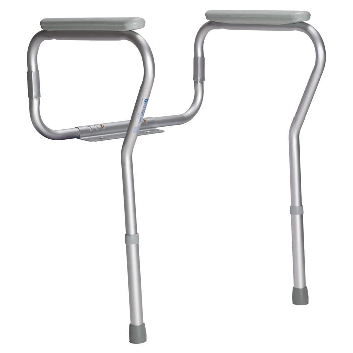 The dynarex toilet safety rail with adjustable height is a supportive and convenient rail that assists users while toileting. The tool-free design features padded armrests, adjustable height and two width positions. This rail is a must for all individuals who have difficulty sitting down or getting up in a bathroom environment. The dynarex safety toilet rail is constructed of a heavy-duty, durable steel frame, which provides added support to any individual with difficulty sitting or standing. The safety toilet rail fits around most standard and elongated toilets and attaches directly to the toilet. The tool-free design features a push button for width and height adjustments to safely accommodate any individual and padded armrests for added comfort. Ideal for use in long term care facilities, hospitals, at home and more.