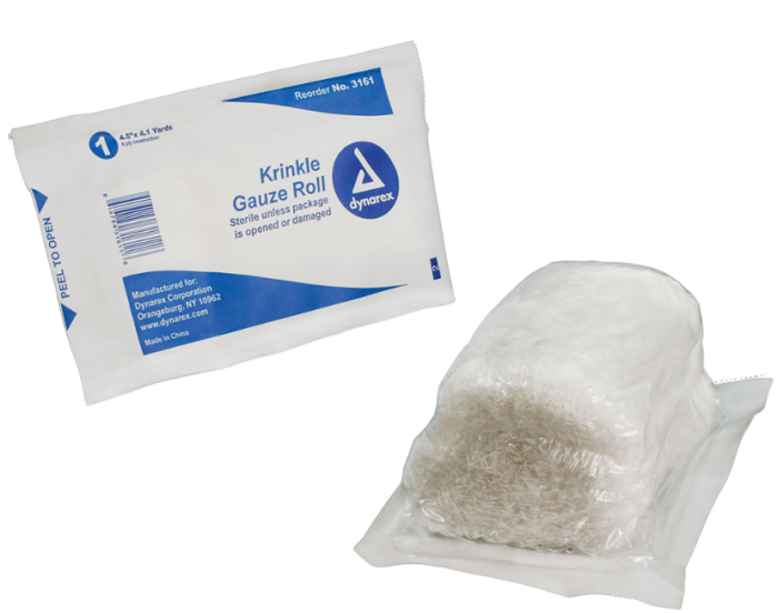 Dynarex Krinkle Gauze Rolls and Sponges are highly absorbent 100% cotton dressings designed to provide cushioning support and protection for sensitive wound areas.