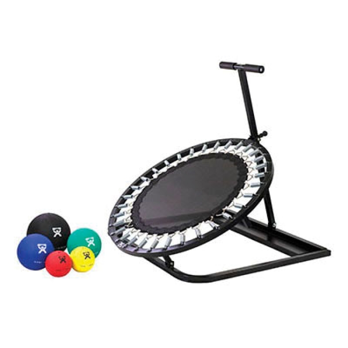 The CanDo® circular ball rebounder, which has a built-in rack, is ideal for physical therapy, rehabilitation and training sessions to improve strength, reflexes and coordination. The rebounder and balls are a fun way to improve conditioning, hand-eye coordination and lateral movements. The rebounding area is a generous 27 in (diagonally) attached by springs to a 36-1/2 x 36 in frame that tops out at 3.5 ft tall. The angle of inclination adjusts from 0 to 42 deg, making this the perfect athletic trainer. The weighted physical therapy balls are versatile as well. With a partner to throw with, the rebounder isn't even needed. With rounded corners and a foam covered handle, the rebounder is safe for all home and multi-use environments. This set comes complete with the rebounder and 5 balls (2, 4, 7, 11, 15 lb each). The rebounder offers a wide variety of benefits to the user. Together, the rebounder and balls work collectively to assist users in improving agility, range-of-motion and upper body fitness. This unit fits and works perfectly indoors or out, in multi-user environments like clinics or gyms or in your own home. The unique design means that it is sturdy enough for balls to be thrown at it, yet it's light enough to be moved easily from room to room. Throwing and catching improves reflexes, coordination, conditioning and speed. It's also excellent to loosen and strengthen shoulders. Like the angle of the rebounder, the balls are adjustable too in terms of how full they are inflated. Under inflate the balls for rebounds to fall short, requiring shorter reaction time to be caught. Or inflate the balls fully for quicker rebounds. The balls, which are color-coded based on weight, contain dry natural rubber.