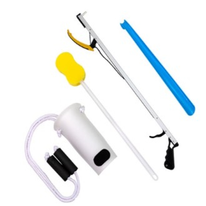 The FabLife Hip Kit is the perfect set of accessories for those who need assistance in their day-to-day tasks. Designed to help users avoid bending at the hip and improve daily living, the hip kit is a variety of selected tools that are vital in assisting patients with bathing, dressing, reaching and other activities. A total package that's ideal for those undergoing hip, knee and back rehabilitation. All the items in the kit help users regain and maintain their independence as well as prevent them from bending, kneeling, reaching and twisting. Included in the kit are a 26" reacher, a contoured sponge with a 17" handle, a formed sock aid and an 18" plastic shoehorn. The kit is a terrific asset to those moving slowly and carefully pre- and post-surgery. The 26" reacher is for people who need to grab items from high (shelves) and low (under the bed). Prevents bending, kneeling or stretching. The contoured sponge with a 17" long handle allows individuals to wash themselves and not feel dependent on anyone else. The formed sock aid is included to aid users in placing socks on their feet and pulling them up, preventing bending, pulling and straining. The kit also includes an 18" plastic shoehorn which assists in putting on shoes, helpful for those with a limited range-of-motionThe FabLife Hip Kit is the perfect set of accessories for those who need assistance in their day-to-day tasks. Designed to help users avoid bending at the hip and improve daily living, the hip kit is a variety of selected tools that are vital in assisting patients with bathing, dressing, reaching and other activities. A total package that's ideal for those undergoing hip, knee and back rehabilitation. All the items in the kit help users regain and maintain their independence as well as prevent them from bending, kneeling, reaching and twisting. Included in the kit are a 26" reacher, a contoured sponge with a 17" handle, a formed sock aid and an 18" plastic shoehorn. The kit is a terrific asset to those moving slowly and carefully pre- and post-surgery. The 26" reacher is for people who need to grab items from high (shelves) and low (under the bed). Prevents bending, kneeling or stretching. The contoured sponge with a 17" long handle allows individuals to wash themselves and not feel dependent on anyone else. The formed sock aid is included to aid users in placing socks on their feet and pulling them up, preventing bending, pulling and straining. The kit also includes an 18" plastic shoehorn which assists in putting on shoes, helpful for those with a limited range-of-motion