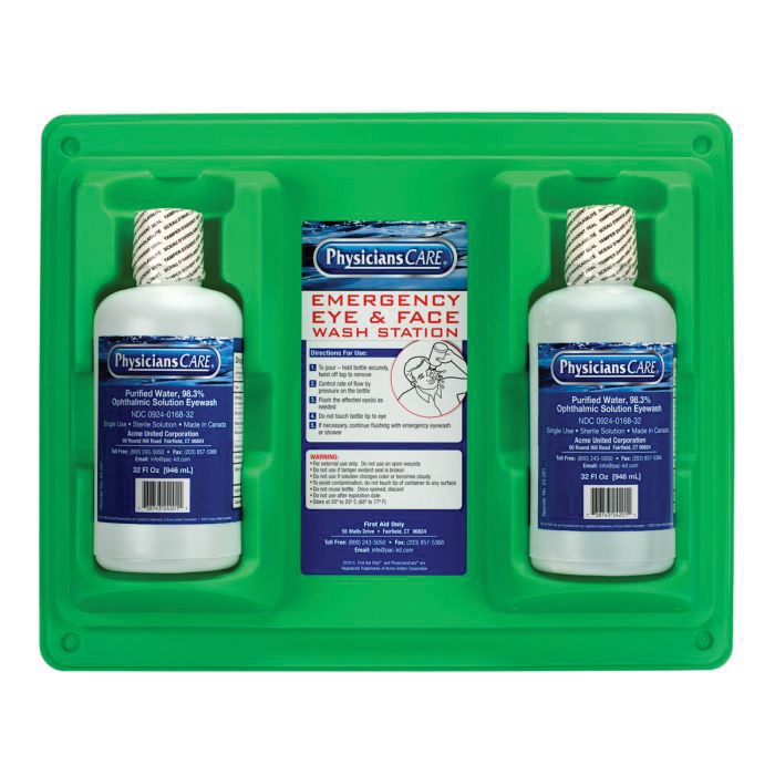 Twin bottle eyewash station with wall-mount. Used for flushing or irrigating the eyes. Includes two 32 oz bottles of eye wash. Sold as wall mount with two 32 oz bottles of eye wash. Easy to install wall-mount kit. Having this eyewash station strategically installed and knowing its location is key for your employers. Multiple eyewash stations may be necessary in your location if you have a large or multiple sites.