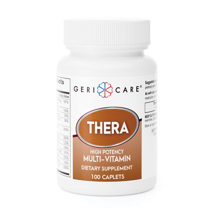 GERI-CARE Thera, 100 CT Net Content, Bottle Container, Caplet Form, 1 Serving, Number of Servings: 1, Active Ingredients: Vitamin A 5000 IU, Vitamin C 90 mg, Vitamin D-3 400 IU, Vitamin E 30 IU, Thiamin 3 mg, Riboflavin 3.4 mg, Niacin 20 mg, Vitamin B-6 3 mg, Folate 400 mcg, Vitamin B-12 9 mcg, Biotin 30 mcg, Pantothenic Acid 10 mg, Inactive Ingredients: Cellulose, Starch, Croscarmellose Sodium. Contains <2% of: Dicalcium Phosphate, Magnesium Stearate, Hypromellose, Silica, Sucrose, Polydextrose, FD and C Red No.40 Lake, Gelatin, Alginate, Triglycerides, Gum Acacia, Talc, Maltodextrin, BHT, Titanium Dioxide, FD and C Yellow No.6 Lake, FD and C Blue No.2 Lake, DL-Alpha Tocopherol, Carnauba Wax and May Contain Monoglyceride