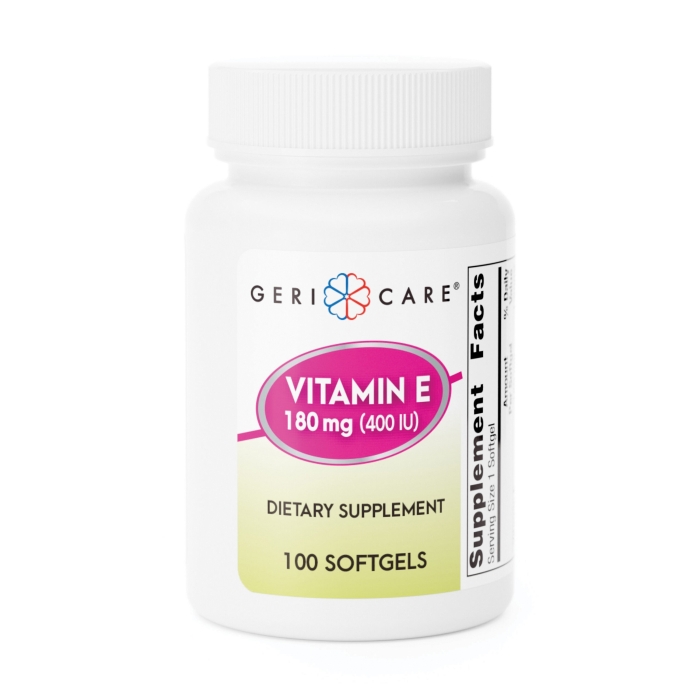 GERI-CARE Vitamin E Tablet, 100 CT Net Content, Bottle Container, Soft Gel Form, 1 Serving, Number of Servings: 1, 180 mcg Strength, Directions: Adults one softgel daily, Active Ingredients: Vitamin E 180 mg (400 IU), Inactive Ingredients: Gelatin, Glycerin, Purified Water. May also Contain Soybean Oil