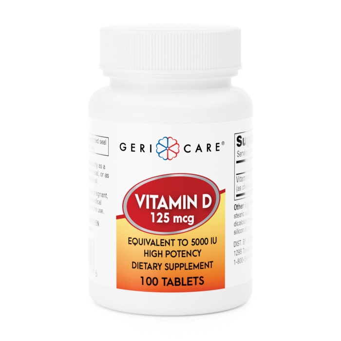GERI-CARE Vitamin D-3 (Cholecalciferol) 125 mcg (5000 IU), Tablet, 100 CT, Dose Delivery Size: 1 Tablet, Inactive Ingredients: Microcrystalline Cellulose, Stearic Acid, Croscarmellose Sodium, Dicalcium Phosphate, Magnesium Stearate, Silicon Dioxide, Hypromellose, Polyethylene Glycol