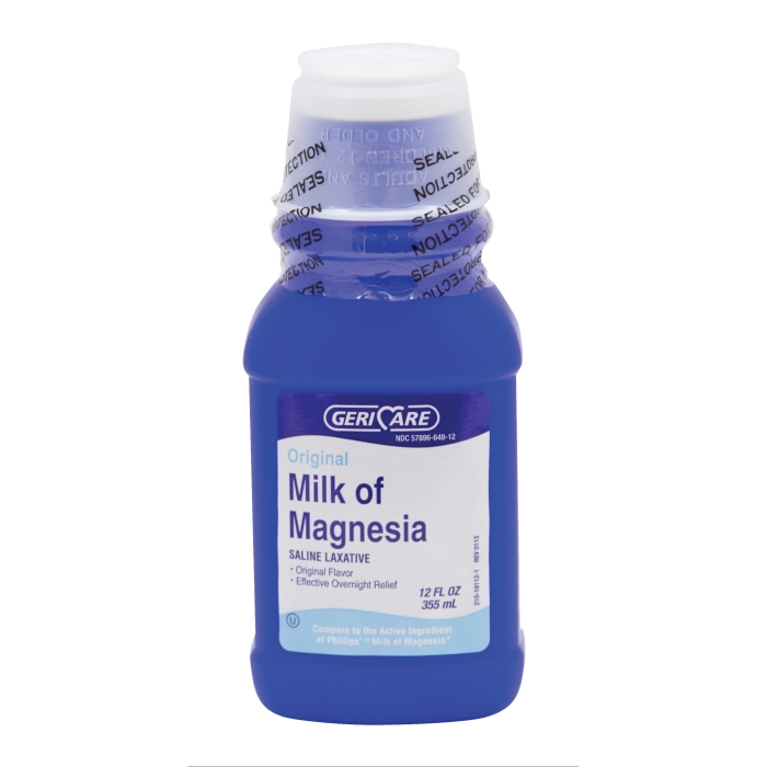 GERI-CARE Milk of Magnesia, 12 fl-oz Net Content, Bottle Container, Liquid Form, Active Ingredients: Magnesium Hydroxide 1200 mg, Inactive Ingredients: Purified Water, Sodium Hypochlorite, Directions: Adults and children 12 years and older: two to four tablespoonful's. Children 6 to 11 years one to two tablespoonful's. Children under 6 years ask a doctor