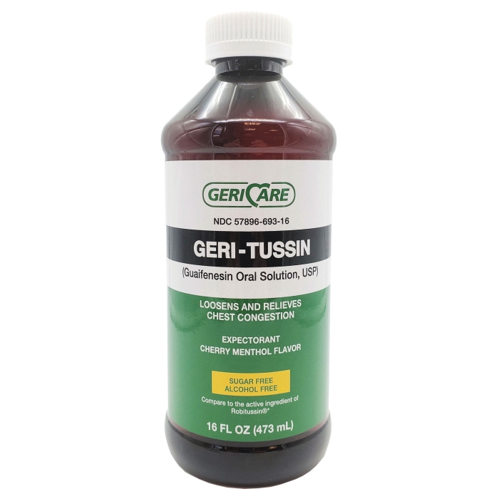 GERI-CARE Cold and Cough Relief Syrup, 16 fl-oz Net Content, Bottle Container, Syrup Form, 100 mg Strength, Storage Temperature: 15 to 30 deg C, Active Ingredients: Guaifenesin USP 100 mg, Inactive Ingredients: Citric Acid, Caramel, FD and C Red No.40, Flavor, Glycerin, Menthol, Sodium Saccharin, Sodium Benzoate, Sorbitol, Water, Directions: Adults and children 12 years and over: two to four teaspoonful's every 4 hr. Do not take more than six doses in any 24 hr period