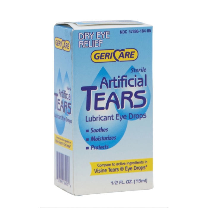 GERI-CARE Artificial Tears Eye Drops, 0.5 fl-oz Net Content, Drops Form, Storage Temperature: 59 to 77 deg F, Inactive Ingredients: Aminoacetic Acid, Ascorbic Acid, Benzalkonium Chloride, Boric Acid, Disodium Phosphate, Glucose, Magnesium Chloride, Potassium Chloride, Purified Water, Sodium Borate, Sodium Chloride, Sodium Citrate, Sodium Lactate, Directions: One to two drops up to 4 times daily
