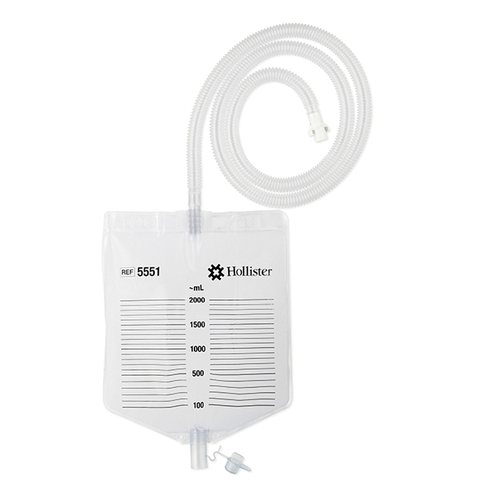Easy-to-use collection bag connects directly to the Hollister high output pouches without the need for connectors. Holds 2000 mL and has punch holes for nightstand attachment.