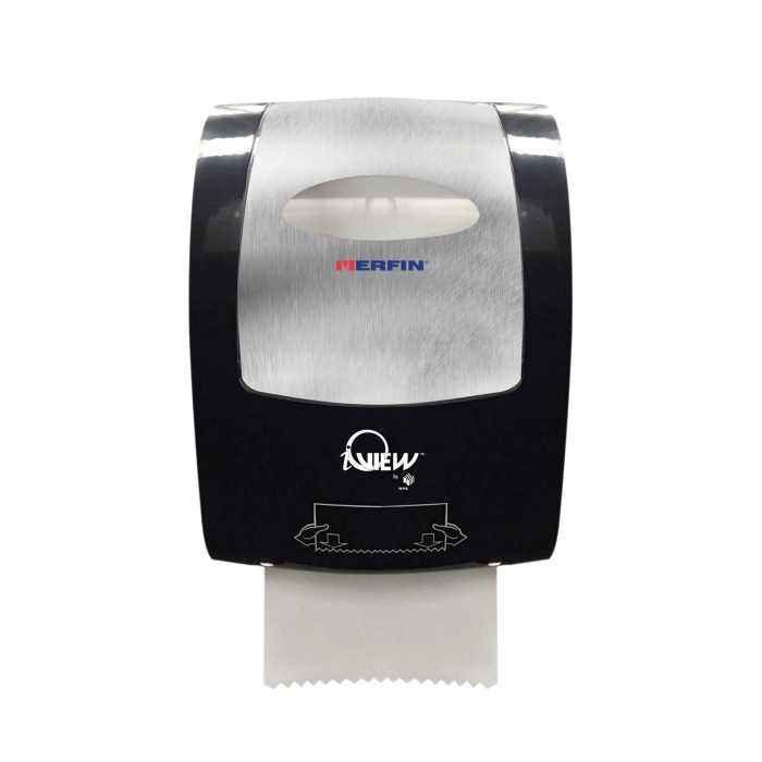 Merfin® Mechanical Hands-Free Roll Towel Dispenser, Automatic/Manual: Manual, 7-1/2 in W Paper, 2.3 in Dia Core, Black, 10.2 in W, 16 in H, 12 in D
