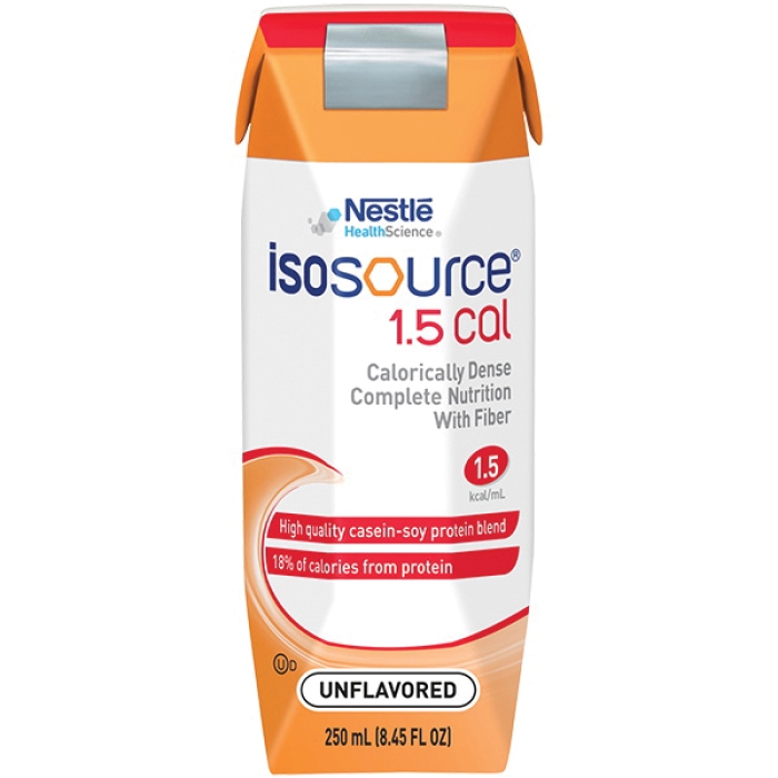 ISOSOURCE® 1.5 Calorie Nutrition, 250 mL Net Content, Ingredients: Water, Glucose Syrup, Canola Oil, Sodium Caseinate (Milk), Soy Protein Isolate and <2% of Medium Chain Triglycerides, Calcium Caseinate, Pea Fiber, Fructooligosaccharides, Potassium Citrate, Inulin (From Chicory), Calcium Phosphate, Potassium Chloride, Maltodextrin, Magnesium Phosphate, Soy Lecithin, Salt, Sodium Ascorbate, Choline Chloride, Calcium Citrate, L-Carnitine, Taurine, Carrageenan, Magnesium Oxide, DL-Alpha Tocopheryl Acetate, Zinc Sulfate, Ferrous Sulfate, Niacinamide, Calcium Pantothenate, Manganese Sulfate, Pyridoxine Hydrochloride, Thiamine Hydrochloride, Copper Sulfate, Riboflavin, Beta-Carotene, Vitamin A Palmitate, Folic Acid, Chromium Chloride, Potassium Iodide, Sodium Molybdate, Sodium Selenite, Vitamin K1, Biotin, Vitamin D3, Vitamin B12, HCPCS Code: B4152, Adult Age Group, 375 kcal Calories Per Serving