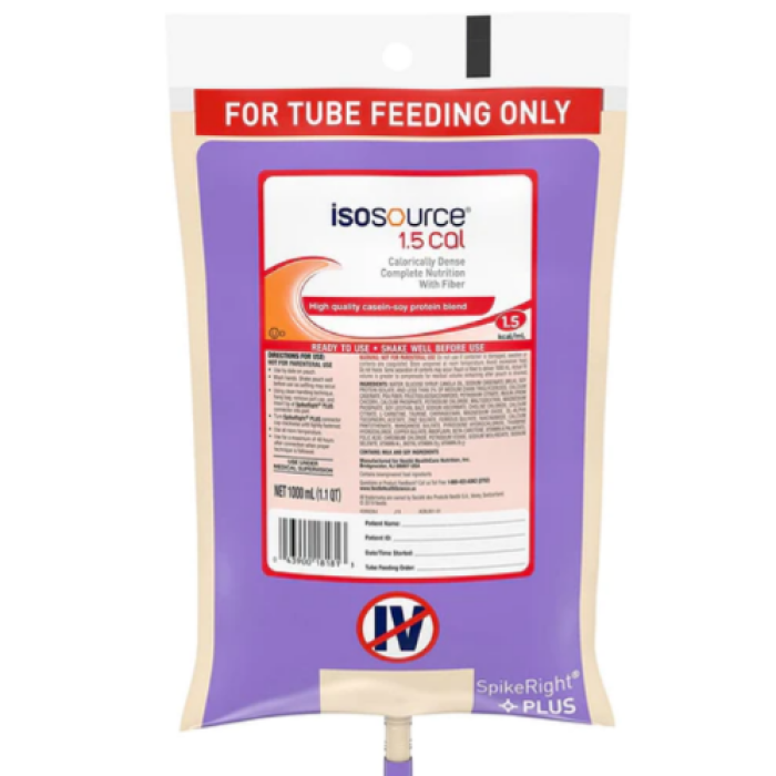 ISOSOURCE® 1.5 Calorie Nutrition, 1000 mL Net Content, Ingredients: Water, Glucose Syrup, Canola Oil, Sodium Caseinate (Milk), Soy Protein Isolate and <2% of Medium Chain Triglycerides, Calcium Caseinate, Pea Fiber, Fructooligosaccharides, Potassium Citrate, Inulin (From Chicory), Calcium Phosphate, Potassium Chloride, Maltodextrin, Magnesium Phosphate, Soy Lecithin, Salt, Sodium Ascorbate, Choline Chloride, Calcium Citrate, L-Carnitine, Taurine, Carrageenan, Magnesium Oxide, DL-Alpha Tocopheryl Acetate, Zinc Sulfate, Ferrous Sulfate, Niacinamide, Calcium Pantothenate, Manganese Sulfate, Pyridoxine Hydrochloride, Thiamine Hydrochloride, Copper Sulfate, Riboflavin, Beta-Carotene, Vitamin A Palmitate, Folic Acid, Chromium Chloride, Potassium Iodide, Sodium Molybdate, Sodium Selenite, Vitamin K1, Biotin, Vitamin D3, Vitamin B12, HCPCS Code: B4152, Adult Age Group, 1500 cal Calories Per Serving