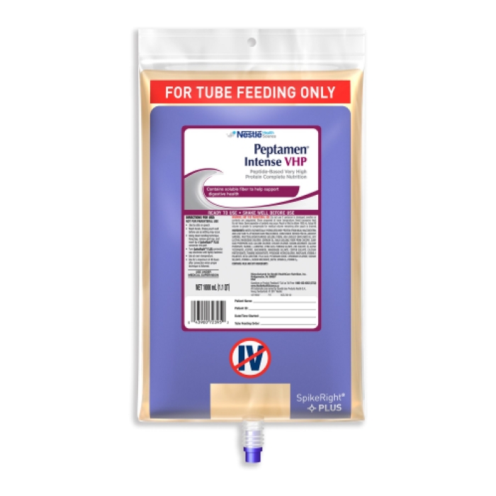 PEPTAMEN® Intense VHP Nutrition, 1000 mL Net Content, Ingredients: Water, Enzymatically Hydrolyzed Whey Protein (Milk), Maltodextrin and <2% of Medium Chain Triglycerides, Cornstarch, Refined Fish Oil (Anchovy, Sardine), Vitamins and Minerals‡, Fructooligosaccharides, High Linoleic Safflower Oil, Soy Lecithin, Soybean Oil, Inulin (From Chicory), Guar Gum. Vitamins and Minerals: Magnesium Chloride, Calcium Chloride, Choline Chloride, Sodium Ascorbate, Calcium Phosphate, Taurine, L-Carnitine, Sodium Citrate, Ferrous Sulfate, Zinc Sulfate, DL-Alpha Tocopheryl Acetate, Niacinamide, Manganese Sulfate, Calcium Pantothenate, Copper Sulfate, Thiamine Mononitrate, Pyridoxine Hydrochloride, Riboflavin, Vitamin A Palmitate, Beta-Carotene, Folic Acid, Potassium Iodide, Chromium Chloride, Sodium Selenate, Sodium Molybdate, Vitamin K1, Biotin, Vitamin D3, Vitamin B12, HCPCS Code: B4153, 1000 cal Calories Per Serving