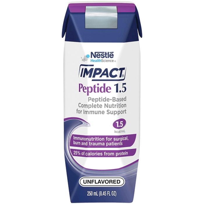 IMPACT® Peptide 1.5 Nutrition, 250 mL Net Content, Ingredients: Water, Maltodextrin, Enzymatically Hydrolyzed Casein (Milk), Medium Chain Triglycerides and <2% of L-Arginine, Cornstrach, Refined Fish Oil (Anchovy, Sardine), Soybean Oil, Citric Acid, Calcium Citrate, Rna Salt, Magnesium Chloride, Potassium Phosphate, Ascorbic Acid, Salt, Soy Lecithin, Sodium Citrate, Choline Chloride, Guar Gum, Xanthan Gum, Potassium Citrate, Taurine, Magnesium Oxide, Sodium Ascorbate, L-Carnitine, DL-Alpha Tocopheryl Acetate, Zinc Sulfate, Ferrous Sulfate, Niacinamide, Calcium Pantothenate, Manganese Sulfate, Copper Sulfate, Pyridoxine Hydrochloride, Beta-Carotene, Thiamine Mononitrate, Vitamin A Palmitate, Riboflavin, Folic Acid, Biotin, Sodium Molybdate, Chromium Chloride, Potassium Iodide, Sodium Selenate, Vitamin K1, Vitamin D3, Vitamin B12, HCPCS Code: B4153, 375 kcal Calories Per Serving