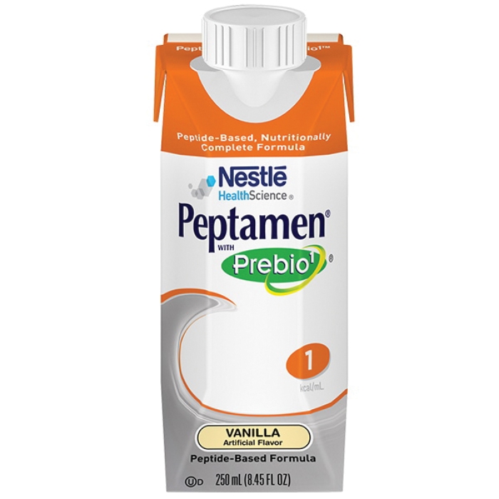 PEPTAMEN® with Prebio¹™ Nutrition, 250 mL Net Content, Ingredients: Water, Maltodextrin, Enzymatically Hydrolyzed Whey Protein (Milk), Medium Chain Triglycerides and <2% of Sugar, Cornstarch, Soybean Oil, Vitamins and Minerals, Inulin (From Chicory), Fructooligosaccharides, Soy Lecithin, Guar Gum, Natural and Artificial Flavor, Sucralose. Vitamins and Minerals: Magnesium Chloride, Calcium Phosphate, Potassium Citrate, Sodium Phosphate, Calcium Citrate, Choline Chloride, Potassium Chloride, Sodium Citrate, Sodium Ascorbate, Magnesium Oxide, L-Carnitine, Taurine, Ferrous Sulfate, Zinc Sulfate, DL-Alpha Tocopheryl Acetate, Niacinamide, Manganese Sulfate, Calcium Pantothenate, Copper Sulfate, Thiamine Mononitrate, Pyridoxine Hydrochloride, Riboflavin, Vitamin A Palmitate, Beta-Carotene, Folic Acid, Potassium Iodide, Chromium Chloride, Sodium Selenate, Sodium Molybdate, Vitamin K1, Biotin, Vitamin D3, Vitamin B12, HCPCS Code: B4153, Vanilla Flavor, 250 cal Calories Per Serving