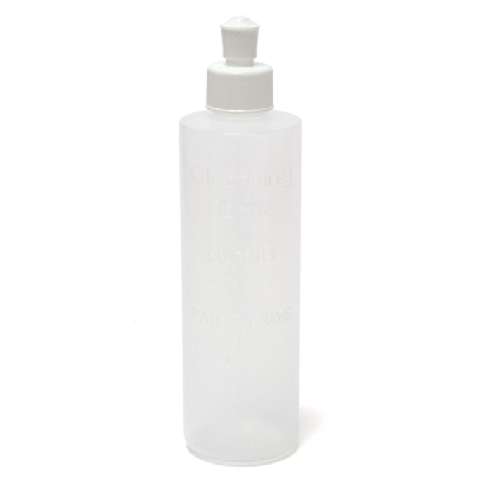 Disposable plastic cleansing bottle with graduations and screw cap. Used to help heal and reduce the chance of irritation or infection of a sutured perineal area, as well as for wound irrigation or ostomy appliance cleansing. Graduations show cubic centimeters and fluid ounces. Regulate water flow by lifting cap and turning. Contains four small holes to produce a gentle spray. Individually bagged.