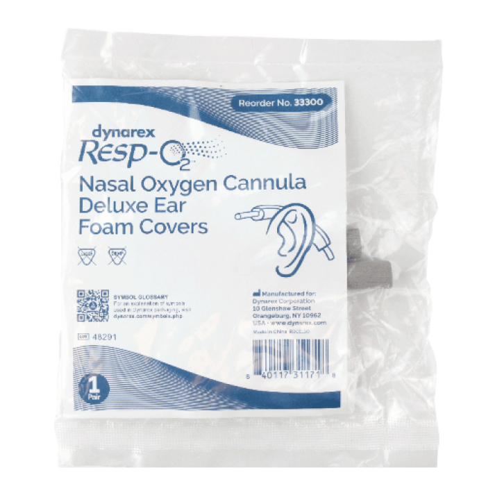 Dynarex Resp-O2 Nasal Oxygen Cannula Ear Foam Covers are soft wraps that fit on a nasal cannula headset to help protect skin against chafing and discomfort.