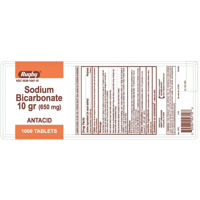 Rugby® Sodium Bicarbonate Antacid, 1000 CT Net Content, Bottle Container, Tablet Form, Active Ingredients: Sodium Bicarbonate 10 g (650 mg), Inactive Ingredients: Croscarmellose Sodium, Microcrystalline Cellulose, Silica, Stearic Acid, Talc, Directions: Do not use the maximum dosage for more than 2 weeks. Tablets may be swallowed whole or dissolved in water prior to use. Adults 60 years of age and over 1 to 2 tablets every 4 hr, not more than 12 tablets in 24 hr. Adults under 60 years of age one to four tablets every 4 hr, not more than 24 tablets in 24 hr, Warning: Do not take more than 24 tablets for adults up to 60 years of age (or 12 tablets for adults 60 years of age and older) in a 24 hr period nor use the maximum dosage for more than 2 weeks, except under the advice and supervision of a physician. Ask a doctor before use if you have a sodium restricted diet. Ask a doctor or pharmacist before use if you are taking a prescription drug. Antacids may interact with certain prescription drugs. Stop use and ask a doctor if symptoms last more than 2 weeks. If pregnant or breast-feeding, ask a health professional before use. Keep out of reach of children