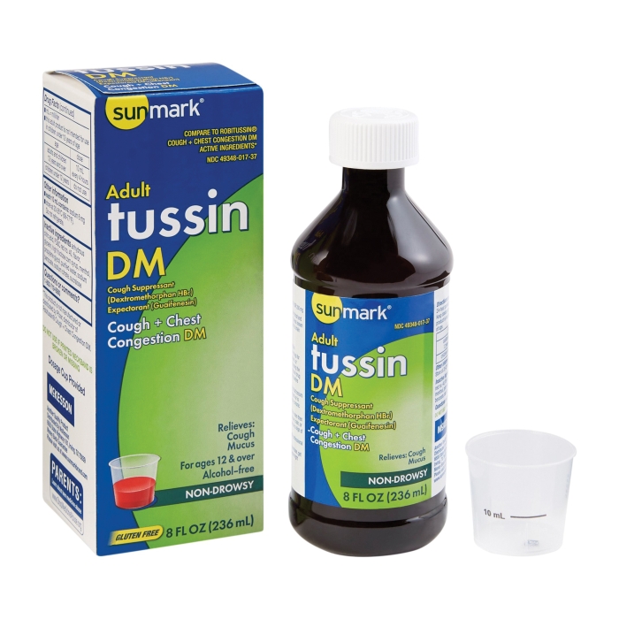 sunmark® Cold and Cough Relief Syrup, 8 oz Net Content, Bottle Container, Syrup Form, 10 to 100 mg, 5 mL Strength, Active Ingredients: Guaifenesin/Dextromethorphan HBr